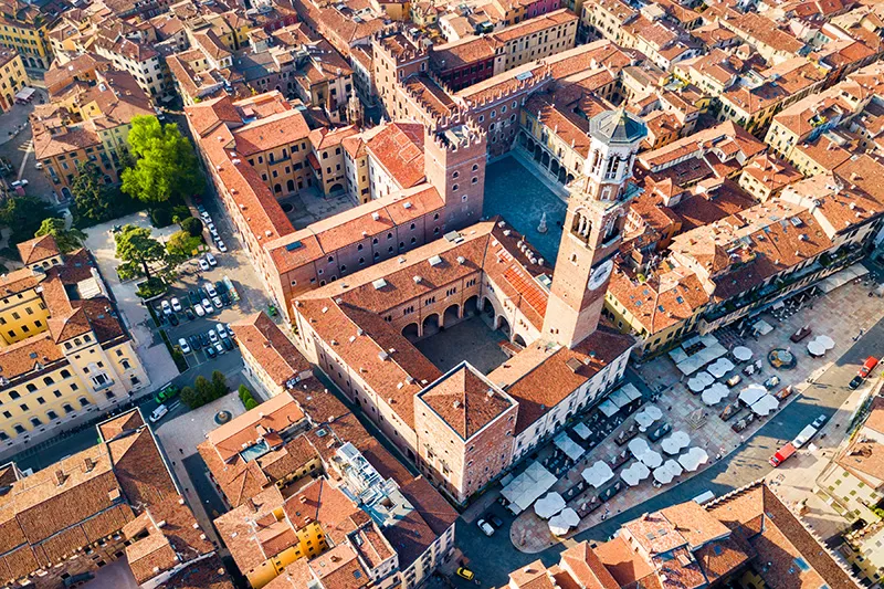 อีกหนึ่งจัตุรัสศูนย์กลางที่เปรียบดั่งห้องโถงกลางแจ้งของเวโรนา ตั้งอยู่ห่างจาก Casa di Giulietta เพียง 300 ม. ที่สะท้อนให้เห็นภาพอำนาจทางการเมืองในยุคกลางผ่านอาคารราชการสำคัญอย่าง Loggia del Consiglio ที่สร้างขึ้นในปลายศตวรรษที่ 15 ด้วยสถาปัตยกรรมเรอเนซองส์อันประณีต ซึ่งเคยใช้เป็นสถานที่ประชุมของสมาชิกสภาเมือง ถัดจากนั้นคือ Palazzo del Capitano และ Palazzo della Ragione ซึ่งเชื่อมต่อกันเป็นสัญลักษณ์แห่งอำนาจบริหารและตุลาการในยุคโบราณ เคยเป็นทั้งที่ว่าการ ผู้ว่าการเมือง และศาลยุติธรรมของเวโรนาในสมัยเมืองรัฐเฟื่องฟู ถัดมาไม่ไกลคือ Arche Scaligere กลุ่มสุสานของตระกูล Scaliger หนึ่งในราชวงศ์ทรงอิทธิพลแห่งเวโรนาในศตวรรษที่ 13–14 ออกแบบอย่างวิจิตรในสไตล์โกธิคตอนปลาย ประดับยอดหลุมศพด้วยรูปปั้นนักรบขี่ม้า รายล้อมด้วยซุ้มประตูหินยอดแหลมแกะสลักลวดลายเรขาคณิตและฉลุอย่างงดงาม ราวบทกวีแห่งเกียรติยศที่แฝงไว้ด้วยเรื่องราวของอำนาจ ความเชื่อ และประวัติศาสตร์เมืองอย่างลึกซึ้ง