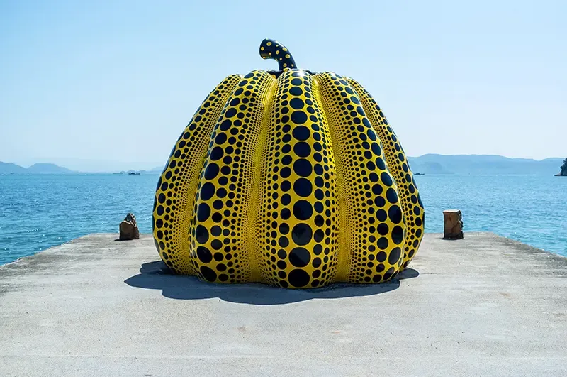ประติมากรรมฟักทองลายจุดสีเหลืองสดริมทะเลคือ จุดหมายห้ามพลาดในการมาเที่ยวที่นาโอชิมะ โดยผลงานชิ้นนี้ตั้งโดดเด่นอยู่ท่ามกลางผืนน้ำสีฟ้าและเส้นขอบฟ้าที่เปิดกว้าง สะท้อนแนวคิดเรียบง่ายในการให้ศิลปะอยู่ร่วมกับภูมิทัศน์ธรรมชาติอย่างกลมกลืน