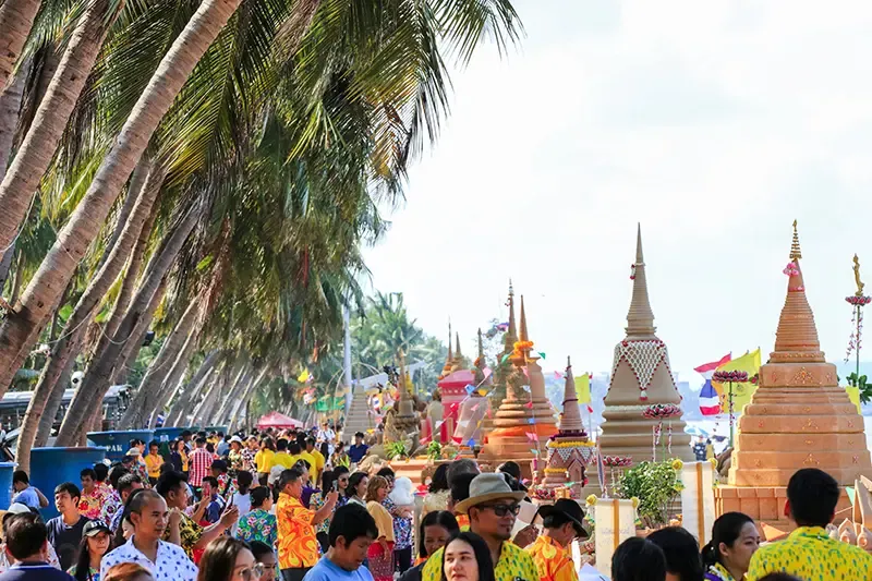 เอ็นจอยกับบรรยากาศสงกรานต์แบบไทย ๆ ที่คุ้นเคยมาตั้งแต่เด็กบนถนนเลียบหาดบางแสน แค่ก้าวออกจากร้านอาหารก็อาจโดนสาดน้ำขำ ๆ ก่อนจะตั้งตัวทัน ความสนุกที่นี่เกิดขึ้นเองแบบไม่ต้องนัดและไหลต่อเนื่องตลอดทั้งวัน รวมผู้คนทุกวัยไว้ในพื้นที่เดียว ตั้งแต่แก๊งวัยรุ่นที่ยืนรอสาดน้ำหน้าร้าน ไปจนถึงครอบครัวที่ตั้งวงเล่นน้ำริมถนน เสียงหัวเราะสลับกับกลิ่นหอยเผาและปลาหมึกย่างจากร้านซีฟู้ดที่ลอยมาเป็นระยะ คอยชวนให้แวะพักแบบไม่รู้ตัว และอีกหนึ่งสีสันที่เติมความละมุนให้สงกรานต์บางแสน คือ “พิธีก่อพระทรายวันไหล” ประเพณีเก่าแก่ที่ชาวบ้านและนักท่องเที่ยวจะช่วยกันก่อเจดีย์ทรายริมชายหาด ตกแต่งด้วยธงสีและดอกไม้เล็ก ๆ อย่างประณีต แฝงความเชื่อเรื่องการนำทรายกลับคืนวัดและเสริมสิริมงคลให้ชีวิต พร้อมต่อเวลาแห่งความสนุกให้ยาวนานกว่าที่อื่นถึง 2 วัน ทำให้ฟีลสงกรานต์ที่นี่เหมือนได้ต่อเวลาความสนุกอีกยก