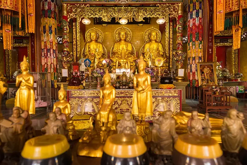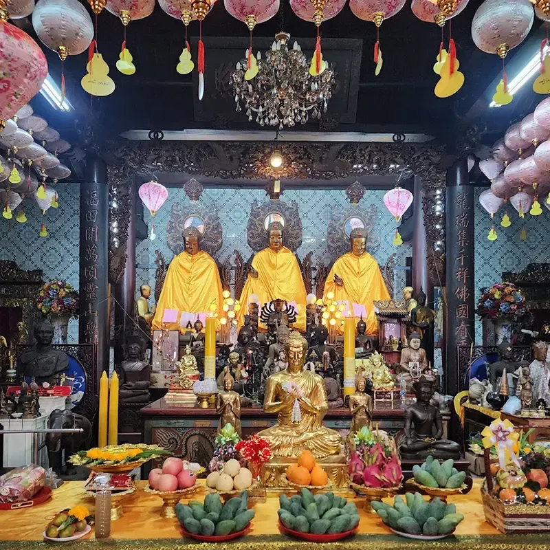 อีกหนึ่งเอกลักษณ์สำคัญคือพระประธานทั้งสามพระองค์ ชุดเดียวกับวัดเล่งเน่ยยี่ อัญเชิญมาจากจีน และสร้างด้วยเทคนิคเปเปอร์มาเช่ปิดทอง เช่นเดียวกับรูปหล่อ 18 อรหันต์อายุกว่า 200 ปีที่ยังคงสภาพงดงามและเปี่ยมคุณค่า ให้ผู้ศรัทธาได้สักการะกัน ภายในวัดโล่งกว้าง เงียบสงบ แฝงพลังแห่งความหวัง ภายใต้สถาปัตยกรรมจีนแต้จิ๋วที่งดงาม ตั้งแต่หลังคาโค้งมังกร เสาแกะสลักลวดลายวิจิตร ไปจนถึงองค์เทพที่ประดิษฐานตามจุดต่าง ๆ ทำให้ผู้มาเยือนได้สัมผัสถึงความศักดิ์สิทธิ์ ความสงบ และวัฒนธรรมจีนอย่างลึกซึ้ง เปี่ยมด้วยพลังศรัทธา