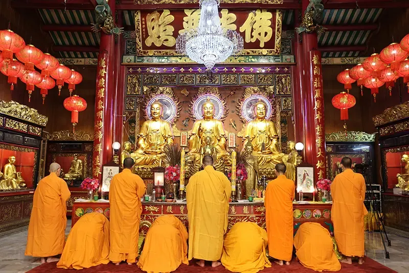 เริ่มจากการตั้งจิตให้สงบ ไหว้ฟ้าดินและวิหารท้าวจตุโลกบาลเพื่อเปิดทางและปัดเป่าสิ่งไม่เป็นมงคล จากนั้นเข้าสักการะพระประธานในอุโบสถ ขอให้เคราะห์ภัยและพลังลบจากปีที่ผ่านมาได้คลี่คลาย แล้วอธิษฐานต่อเรื่องความสุข ความสมดุล และความราบรื่นของชีวิต ปิดท้ายด้วยการสักการะพระโพธิสัตว์ โดยเฉพาะพระอวโลกิเตศวรและพระกษิติครรภ์โพธิสัตว์ มีเคล็ดลับคือ ควรขอพรทีละเรื่องอย่างชัดเจน และหยุดนิ่งหายใจลึก ๆ 3 ครั้งหลังอธิษฐาน เชื่อกันว่าจะช่วยให้จิตตั้งมั่น รับพลังเมตตา สติ และความมั่นคงทางจิตใจ