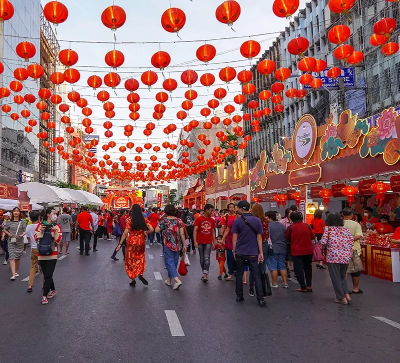 ชุมชนชาวจีนบนถนนมังกรสายหลักของกรุงเทพฯ คือหัวใจของชุมชนชาวจีนที่ไม่เคยหลับใหล และจะยิ่งคึกคักขึ้นในช่วงเทศกาลไหว้พระจันทร์ เมื่อถนนทั้งสายได้กลายเป็นเวทีแห่งสีสันและความครึกครื้น คับคั่งไปด้วยร้านค้าประดับไฟสว่างไสว มีร้านขนมไหว้พระจันทร์นับร้อยที่นำเสนอทั้งสูตรดั้งเดิมและรสชาติใหม่ ๆ ให้เลือกชิมไม่รู้จบ พร้อมด้วยขบวนเชิดสิงโตและมังกรเคลื่อนไหวท่ามกลางเสียงกลองก้องกังวานที่คอยเติมเต็มบรรยากาศให้ค่ำคืนสุดพิเศษแห่งปีเป็นไปอย่างสมบูรณ์แบบ ทั้งหมดนี้ได้หล่อหลอมให้เยาวราชมีชื่อเสียงโด่งดังมากกว่าการเป็นเพียงแหล่งรวมอาหารอร่อยระดับตำนาน แต่ยังเป็นภาพสะท้อนการอยู่ร่วมกันระหว่างวัฒนธรรมจีนเก่าแก่กับความทันสมัยของมหานครใหญ่อย่างกลมกลืน