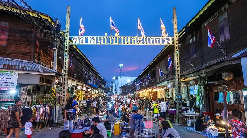 ตลาดเก่าแก่ริมแม่น้ำแม่กลองที่มีประวัติยาวนานกว่า 100 ปี ก่อตั้งโดยชาวจีนแต้จิ๋วที่อพยพมาตั้งถิ่นฐานเพื่อค้าขายและทำการเกษตร เป็นแหล่งรวมวัฒนธรรมและรสชาติอาหารพื้นถิ่น ขึ้นชื่อเรื่องอาหารและขนมโบราณหายาก เช่น ก๋วยเตี๋ยวแคะ หมูแดงโบราณ ขนมกุยช่าย และขนมไหว้พระจันทร์สูตรดั้งเดิมซึ่งจะมีให้ลิ้มลองเฉพาะในช่วงเทศกาลไหว้พระจันทร์เท่านั้น ในวันเทศกาลตลาดจะคึกคักมีชีวิตชีวา ประดับโคมไฟหลากสีเรียงรายตลอดสองฝั่งแม่น้ำ เพลิดเพลินไปกับการชิมรสอาหารพื้นบ้าน ร่วมทำขนมไหว้พระจันทร์แบบโบราณ สักการะเทพเจ้ากวนอูที่ศาลเจ้าพ่อกวนอู (เล่าซินเฮงตั๋ว) ศูนย์รวมความศรัทธาของชาวจีนที่สร้างขึ้นตั้งแต่สมัยรัชกาลที่ 5 และชมการแสดงเชิดสิงโตหรือขบวนแห่มังกรเล็ก ๆ ที่พลิ้วไหวเพิ่มสีสันให้ทุกก้าวสนุกยิ่งขึ้น สามารถลัดเลาะซอยเล็ก ๆ ชมร้านค้าโบราณและบ้านไม้เก่าที่สะท้อนเรื่องราวประวัติศาสตร์และวิถีชีวิตชุมชน