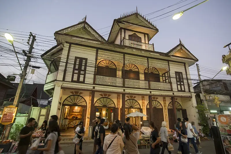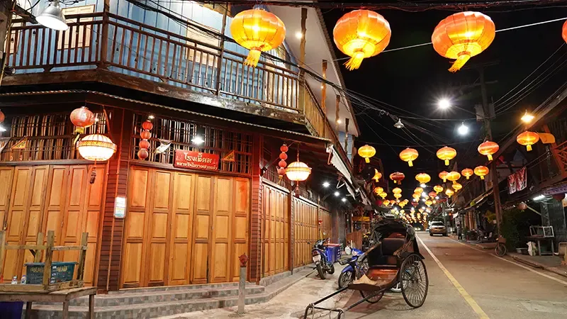 ชุมชนชาวจีนแห่งแดนเหนือซ่อนตัวอยู่ในตลาดโบราณอายุกว่าร้อยปี ซึ่งสะท้อนเอกลักษณ์การผสมวัฒนธรรมจีนและพม่าที่โดดเด่นไม่เหมือนใคร โดยเฉพาะในช่วงเทศกาลไหว้พระจันทร์ ถนนคนเดินสายนี้จะสว่างไสวด้วยโคมไฟหลากสี สองข้างทางเต็มไปด้วยร้านอาหารจีน-ล้านนา และร้านขนมไหว้พระจันทร์โบราณหาทานยาก นักท่องเที่ยวสามารถชมการแสดงเชิดสิงโตที่ผสานฟ้อนและดนตรีพื้นบ้าน ร่วมพิธีเซ่นไหว้แบบดั้งเดิม และถ่ายภาพเช็กอินกับเยียนซีไท้ลีกี ตึกเก่าสุดคลาสสิกที่สร้างขึ้นตั้งแต่ปลายสมัยรัชกาลที่ 5 เป็นคฤหาสน์ของคหบดีจีนตระกูลทิวารี ด้วยสถาปัตยกรรมจีนโบราณผสมสไตล์ตะวันตก ประดับด้วยไม้แกะสลัก ฝ้าเพดานสีทองและหน้าต่างกระจกสีที่สวยงาม มอบกลิ่นอายความมั่งคั่งแบบชาวจีนในอดีต