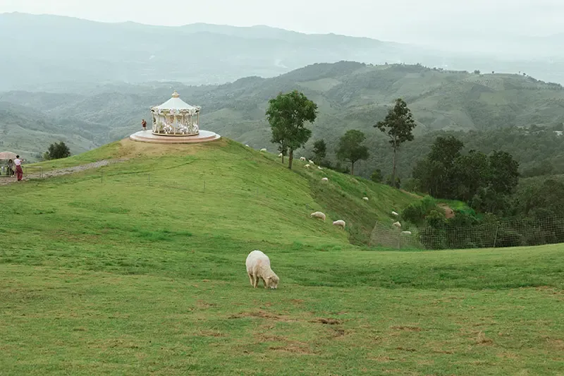 คาเฟ่ฟาร์มแกะและที่พักสุดอบอุ่นบนดอยช้าง ซ่อนตัวอยู่ท่ามกลางหุบเขาแม่สรวยอันเงียบสงบ ที่นี่คือมุมโปรดของคนรักหมอก เพราะทุกเช้าสายหมอกบางๆ จะลอยคลอเคลียไปตามแนวทุ่งนา และโอบกอดแลนด์มาร์กยอดฮิตอย่าง “ม้าหมุนอาข่า” ไว้ราวฉากในนิทาน บรรยากาศยามอรุณละมุนราวภาพวาด เหมาะสำหรับคนที่อยากปล่อยเวลาให้เดินช้าลง จิบกาแฟร้อนสักแก้ว พร้อมชมทะเลหมอกลอยตัวเหนือผืนเขียวอย่างไม่ต้องรีบร้อน