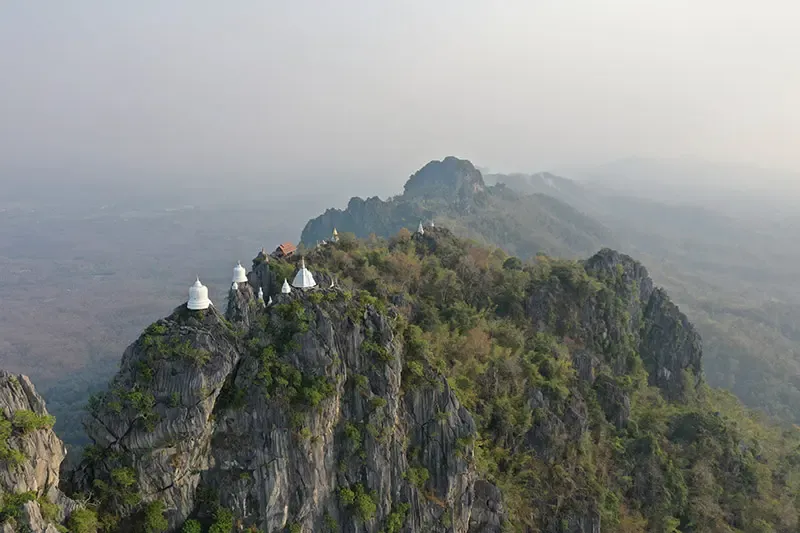 หรือที่รู้จักกันในอีกชื่อคือ วัดพระพุทธบาทปู่ผาแดง หนึ่งในจุดหมายบนภูเขาที่งดงามและแปลกตาที่สุดของภาคเหนือ ด้วยภาพของเจดีย์สีขาวบริสุทธิ์หลายองค์ตั้งประดับบนยอดเขาหินปูนสูงราว 1,020 ม. ราวกับกำลังล่องลอยอยู่เหนือทะเลหมอกและผืนป่าลึกเบื้องล่าง ทางขึ้นต้องนั่งรถกระบะต่อด้วยการเดินเท้าขึ้นบันไดเพื่อไปถึงจุดชมวิว ทำให้เมื่อไปถึงแล้วจะรู้สึกถึงความสงบศักดิ์สิทธิ์อย่างจับใจ ในยามเช้าคือช่วงเวลาที่สวยที่สุด แสงอาทิตย์สีทองจะสาดลงบนเจดีย์และศาลาไม้สไตล์ล้านนาที่ตั้งเรียงรายริมหน้าผา เผยให้เห็นสถาปัตยกรรมที่ผสานศรัทธา งานช่างท้องถิ่น และธรรมชาติอันยิ่งใหญ่อย่างงดงามเกินบรรยาย สะท้อนความน่าศรัทธาและงดงามจนกลายเป็นหนึ่งในแลนด์มาร์กที่ผู้มาเยือนลำปางไม่ควรพลาด