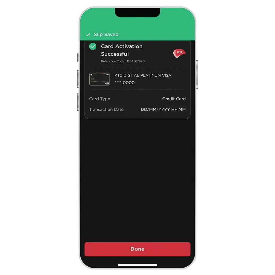 Activate the KTC DIGITAL credit card by enable the Card-Not-Present spending limit via the KTC Mobile app. The Card can be used instantly after activated.