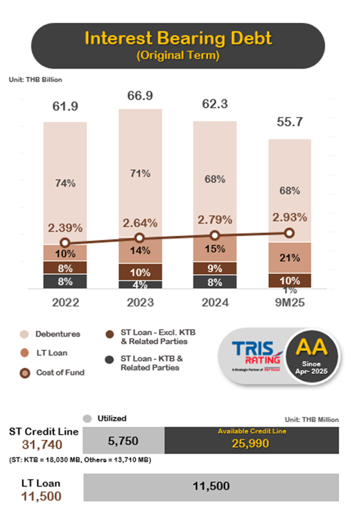 As of the end of 3Q2025, the Group maintained a strong capital structure with well-diversified funding sources, totaling THB 55,655 million in borrowings (including lease liabilities). Long-term borrowings accounted for 70% of total borrowing, while short-term borrowings (including short-term loans and debentures due within one year) represented 30%. KTC’s funding sources remained well-diversified across Thai commercial banks, securities companies, insurance firms, and investment funds. This comprised short-term borrowing from Krungthai Bank and related parties of THB 380 million, short-term borrowing from other financial institutions of THB 5,400 million, long-term loans from Krungthai Bank totaling THB 11,500 million, and debentures of THB 38,094 million. Debentures accounted for approximately 68% of total borrowings, reflecting strong investor confidence and KTC’s solid access to the domestic bond market.