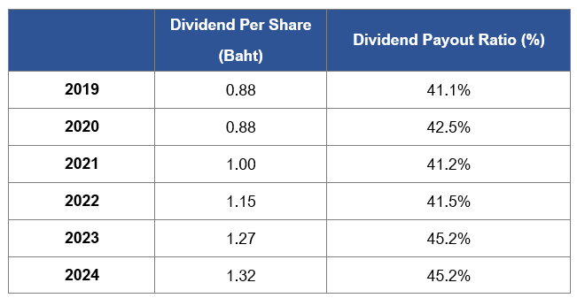 The shareholders’ meeting no. 1/2003 on March 25, 2003, approved the dividend payment policy to pay approximately 40 percent of net profit after deduction of income tax and appropriation for a legal reserve since 2003 onward. The table below shows the dividend payment for the operating result during 2019 – 2024.