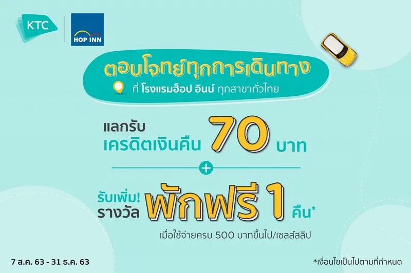 “KTC”orKrungthai Card Public Company Limited,jointly organize hot promotion withHop Inn hotel nationwideincluding Buriram, Chonburi, Chiangmai, Chiang Rai, Chumphon and Hat Yai. KTC credit cardmembers who make transactions valued at 500 Baht or more per sales slip using KTC credit cards earn double privileges:1) 70 Baht credit cash back e-Couponsvia KTC Mobile Application with the usage of 500 KTC FOREVER points, and2) Earn chances to stay one night free of charge(10 prizes/month) for qualifying purchasesbetween August 7, 2020 to December 31, 2020.