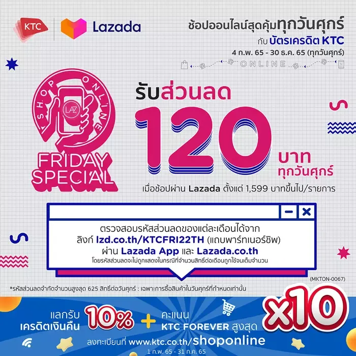 “KTC” or Krungthai Card Public Company Limited,jointly with“Lazada”offers a super value promotion for all KTC credit cardmembers. Cardmembers get a120 baht discount every Fridayas part of the “KTC x LAZADA Friday Special” campaign, by spending 1,599 baht or more/net transaction via www.lazada.co.th or on Lazada app from February 4 to December 30, 2022, up to 625 codes/Friday. View monthly discount codes atlzd.co/KTCFRI22TH.Plus, enjoy more value by redeeming 200 baht Lazada discount codes via the KTC Mobile appupon a minimum spend of 1,000 baht with the usage of 999 KTC FOREVER points from February 15 to April 30, 2022, or until the codes run out.For more information, visithttps://ktc.today/Lazada-promo.