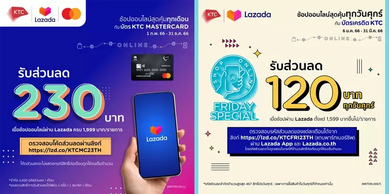 “‘Lazada’ is KTC’s major e-commerce partner; collectively we have created a well-established network of online shoppers. Recently, we teamed up to launch 2 marketing campaigns and offer KTC credit cardmembers special privileges on purchases of products via www.Lazada.co.th or the Lazada app. The privileges include1) KTC Lazada Friday Special: enjoy a 120 baht discountupon spending 1,599 baht or more per net transaction and pay with any KTC credit card every Friday until Friday, March 31, 2023, and2) KTC MASTERCARD Always On:KTC-MASTERCARD credit cardmembers exclusivelyenjoy a 230 baht value discountupon spending 1,999 baht per transaction from February 1 to December 31, 2023. For much more amazing promos, visit https://www.ktc.co.th/promotion/online/shopping/lazada-all.”