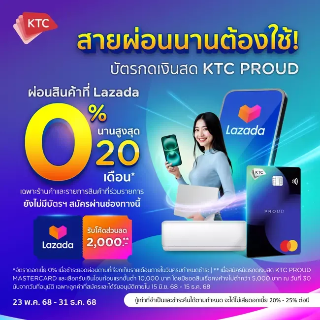 KTC PROUD MASTERCARDandKTC PROUD UnionPayCash Card members can pay for products in installments at 0% interest for up to 20 months on the Lazada website or app. Additionally, new “KTC PROUD MASTERCARD” cardholders are eligible to receive a Lazada discount code worth 2,000 baht upon applying for a KTC PROUD MASTERCARD Cash Card. Simply apply via the linkhttps://ktc.promo/LZDPR, get approved between 15 June 2025 and 15 December 2025, choose to receive an initial lump sum of at least 10,000 baht, and have an outstanding balance of at least 5,000 baht as of 30 days from the approval date.