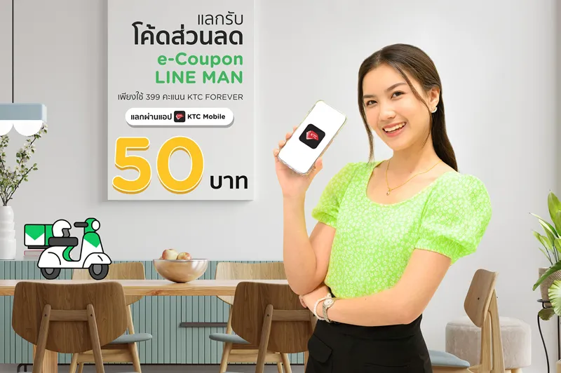 “KTC”orKrungthai Card Public Company Limited,offers a special privilege for cardmembers toredeem only 399 KTC FOREVER pointsfor50 BahtLINE MANdiscount e-Couponsby making transactions with a KTC credit card at a minimum value of 300 Baht or more. Cardmembers may redeem for discount codes via the KTC Mobile appfrom March 10 to August 31, 2021(limited to 3,000 redemptions throughout the promotion period and discount is redeemable for participating restaurants only).