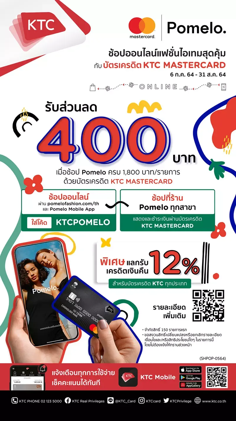 “KTC”orKrungthai Card Public Company Limited,a leader in the credit card business, partners withPomelo,a fashion platform born in Asia offering an assortment of on-trend designs at reasonable prices,in offering 400 baht discount exclusively to cardmembers of all KTC-MASTERCARD credit card types.Cardmembers enjoy the privilege by shopping participating products valued at 1,800 baht or more per transaction viawww.pomelofashion.com/thor on the “Pomelo” App with the usage of the “KTCPOMELO” discount code before checkout or pick-up at stores. Cardmembers can also enjoy this discount at all Pomelo stores simply by presenting and paying for products with a KTC-MASTERCARD credit cardfrom July 6 to August 31, 2021(limited quantity offer). For more details, please visithttps://ktc.today/Pomelo. Plus, all KTC credit cardsredeem extra12% cash back with the usage of KTC FOREVER points in the amount equivalent to the redeeming payment/transactionfrom July 1 to December 31, 2021.Register every time within transaction date athttps://ktc.promo/fashion-fsmor SMS by type in FSM (space) 16 digit card number, the “#” symbol, the payment amount/transaction (exclude “,” and “.”) and send to 061 384 5000.
