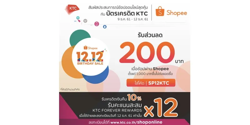 “KTC”orKrungthai Card Public Company Limited,partner with“Shopee,”the leading e-commerce platform in Southeast Asia and Taiwan, to celebrates its anniversary with Shopee 12.12 Birthday Sale campaign. Members experience worthwhileness with double special privileges for purchases of products using the “Shopee” application orwww.shopee.co.thbetween December 9 - 12, 2018. First privilege Bt. 200 discountfor purchases of products worth Bt. 1,000 or more per transaction using KTC credit cards and apply“SP12KTC”discount code.Second privilege redeem for 10 percent cash back and X5 KTC FOREVER rewards pointseveryday orredeem for 10 percent cash back and X12 KTC FOREVER rewards pointsfor transactions at Shopee and register on December 12, 2018 only.