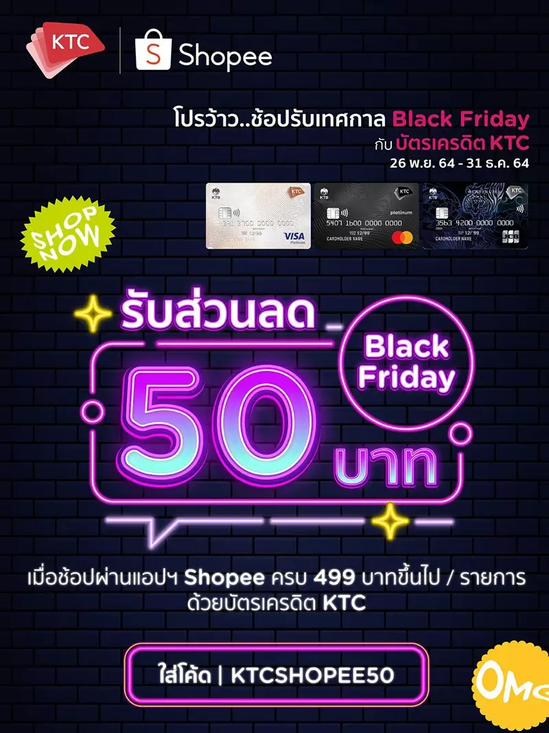 “KTC”orKrungthai Card Public Company Limited,partners with“Shopee”and organises an exclusive promotion for KTC credit cardmembers. Cardmembersenjoy a 50 baht discountby shopping favourite items on the Shopee App after Thanksgiving or Black Fridaywhen spend 499 baht or more per transactionand apply the “KTCSHOPEE50” code before checkout from November 26, 2021 to December 31, 2021. For more information, please visithttps://ktc.today/Shopee-BlackFriday. Additionally, redeem 10% cashback and up to 10x KTC FOREVER points with the usage of points in the amount equivalent to the transaction. Click the link to register: www.ktc.co.th/shoponlinefrom August 1, 2021, to January 31, 2022.To register for any KTC credit card, click the link: https://ktc.today/apply-card, contact KTC Phone Tel. 0-2123-5000 or visit any “KTC TOUCH” branches nationwide.