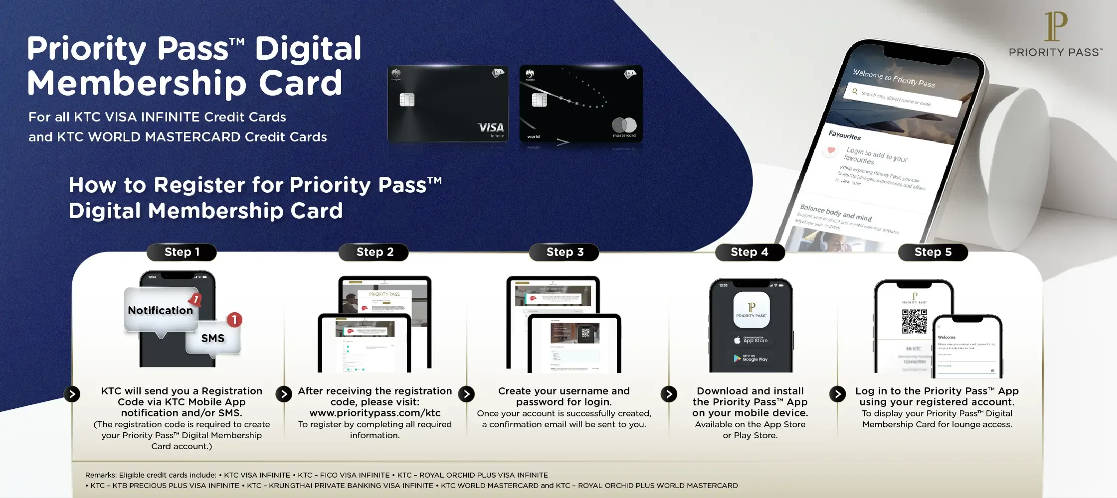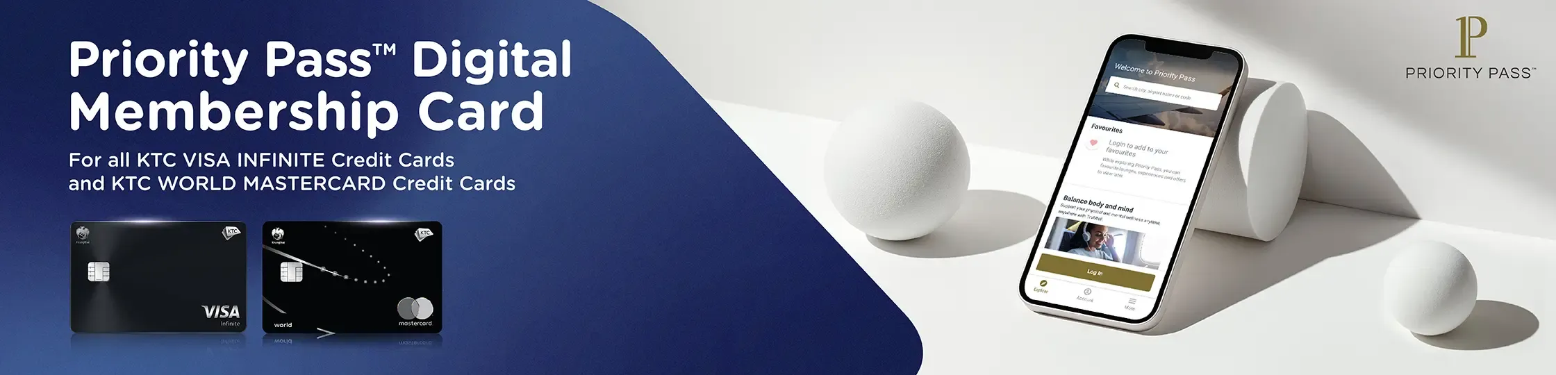 KTC VISA INFINITE and KTC WORLD MASTERCARD Cardmembers (all card types), including both principal and supplementary cards that are eligible under the specified conditions, can access airport lounges worldwide via Priority Pass™ Digital Membership Card on the Priority Pass™ application, effective from 1 February 2026 onwards.