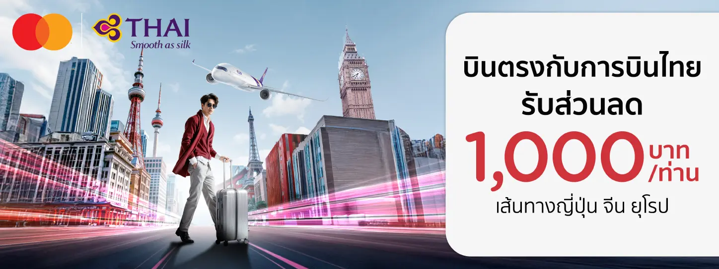 when booking a round-trip THAI Airways ticket on eligible Japan, China and Europe routes via https://ktc.promo/TG-MC website and pay with a KTC MASTERCARD credit card only.