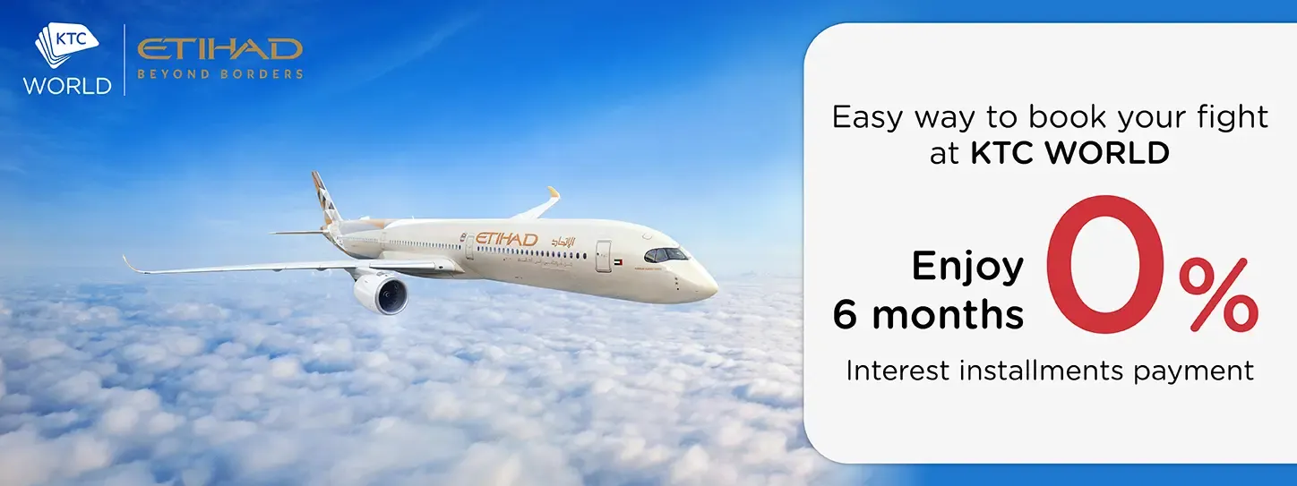 Special fares from Etihad Airways to popular destinations such as Europe and America. Redeem every 1,000 KTC FOREVER for a discount of 130 Baht and can also make 0% installment transactions for 6 months when spending 3,000 Baht or more / sales slip. Special privileges for KTC credit card members at KTC World Travel Service