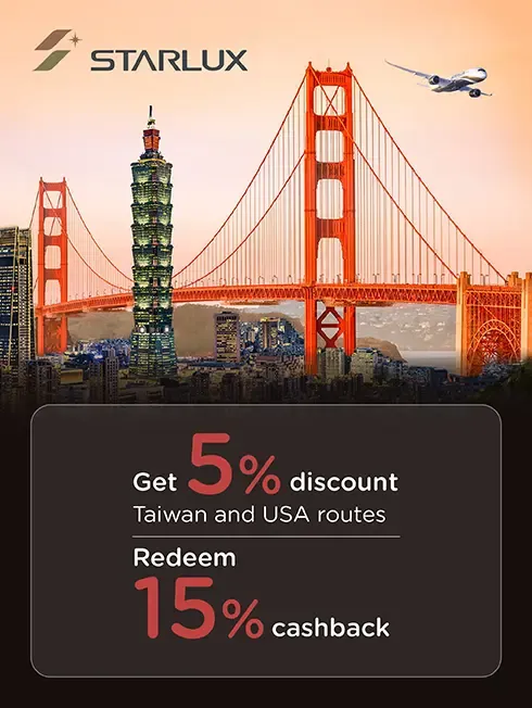 When spending with KTC credit card and booking with STARLUX Airlines via www.STARLUX-Airlines.com and STARLUX Mobile Application redeeming KTC FOREVER points in the amount equivalent to the payment per sales slip.