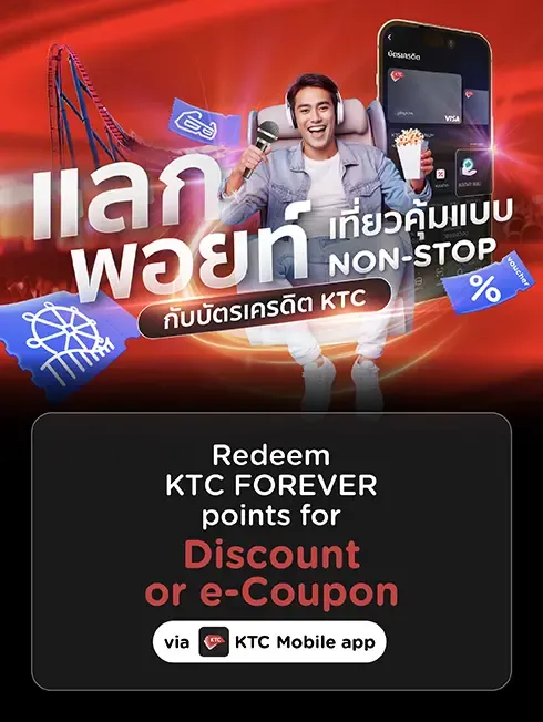 KTC, your one card for all travel needs. Watch movies, enjoy indoor activities, outdoor trips, or attend concert events. Redeem KTC Forever points for discounts or e-coupons through the KTC Mobile app – easy and the most rewarding, fitting every lifestyle.
