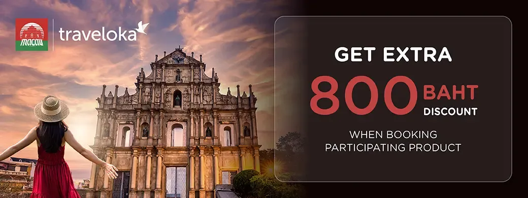 - Coupon code for customers KTCMACAO800 – Discount of THB 800 when booking a participating Flight, Hotel, and Attractions at Traveloka with minimum spending of 6,000 Baht per a booking (excluding travel insurance or flight add-ons)