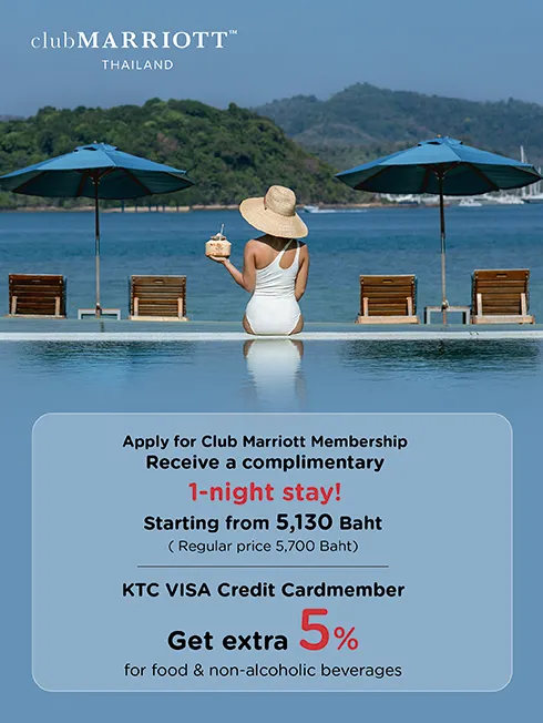 Get an on-top 5% discount on food and non-alcoholic beverages  from Club Marriott members when spending your KTC VISA Credit Card and show both members at the restaurants in Bangkok participating hotels
