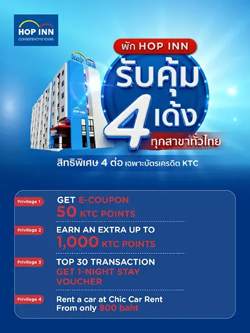 Enjoy 4 privileges when spend by KTC credit card at any Hop Inn hotel in Thailand from 1 Sep 25 – 28 Feb 26