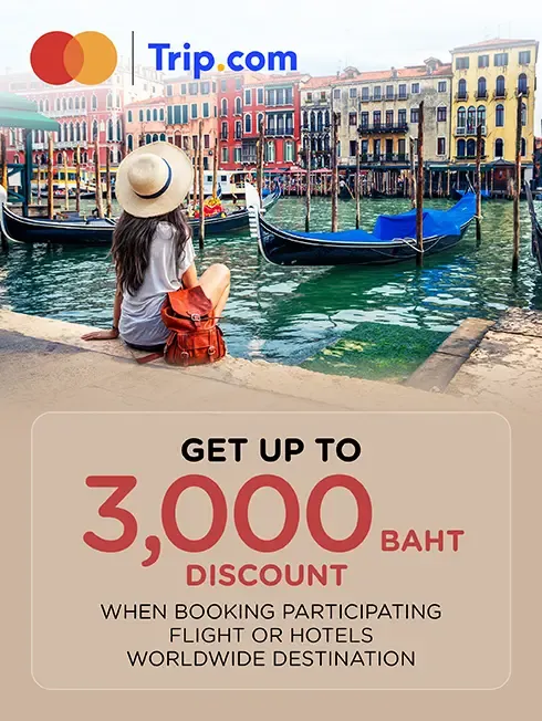 Monthly Promotion: Get up to 3,000 THB discount when booking flights or hotels worldwide on Trip.com with your KTC Mastercard credit card.