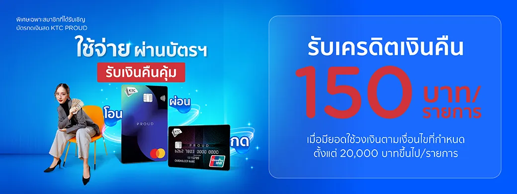 - รายการส่งเสริมการขาย (“รายการ”) นี้ บริษัท บัตรกรุงไทย จำกัด (มหาชน) หรือเคทีซี จัดทำขึ้นเพื่อมอบเครดิตเงินคืนจำนวน 150 บาท สำหรับสมาชิกสินเชื่อบัตรกดเงินสด KTC PROUD (“สมาชิก”) ที่ได้รับข้อความเรียนเชิญเข้าร่วมรายการ และมียอดใช้วงเงินสินเชื่อบัตรกดเงินสด KTC PROUD (“สินเชื่อ”) โดยเบิกถอนผ่านแอป KTC mobile หรือผ่านตู้ ATM หรือมียอดผ่อนชำระค่าสินค้า/บริการ ตั้งแต่ 20,000 บาทขึ้นไป อย่างน้อย 1 รายการ ตามเงื่อนไขที่กำหนด ในระหว่างวันที่ 9 มกราคม 2569 – 28 กุมภาพันธ์ 2569 (“ระยะเวลารายการ”)