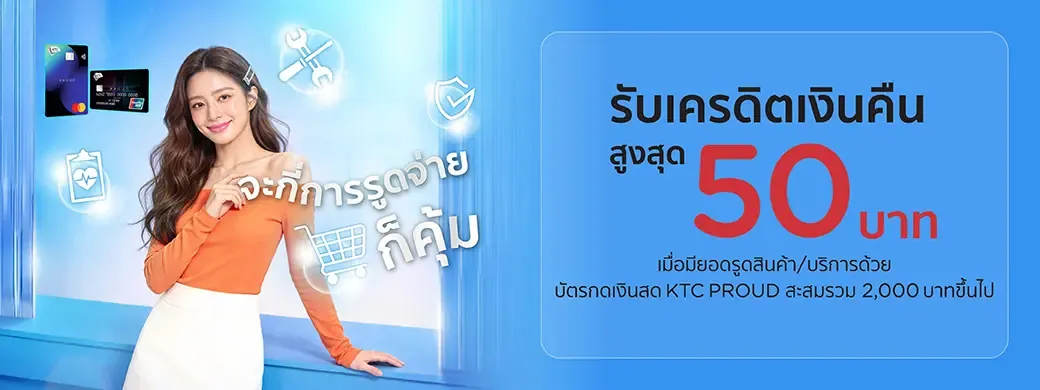 - เมื่อสมาชิกมียอดรูดซื้อสินค้า/บริการสะสมผ่านบัตรกดเงิน KTC PROUD ภายในระยะเวลารายการ จะได้รับเครดิตเงินคืนตามที่กำหนด ยอดรูดซื้อสินค้า/บริการตั้งแต่ 2,000 บาทขึ้นไป รับเครดิตเงินคืน 50 บาท