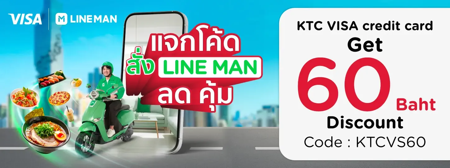 - This promotional campaign (“Promotion”) is provided by Krungthai Card Public Company Limited or KTC to offer the exclusive privileges to members of KTC VISA credit card (“Cardmember(s)”) who spend on card at LINE MAN on September 8th, 2025 – February 28th, 2026 (“Promotion Period”) according to specified terms and conditions only.