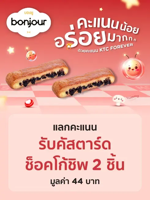 - Cardmember can redeem 349 KTC Points for 2 Choco Chip Custard, valued at 44 baht. via KTC Mobile App according to the specified terms and conditions.