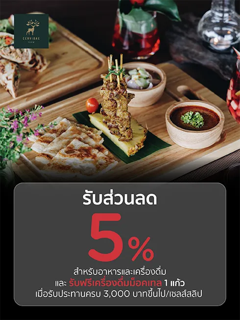 Get 5% discount on food and beverage and get free 1 mocktail when spending 3,000 baht or more / sales slip