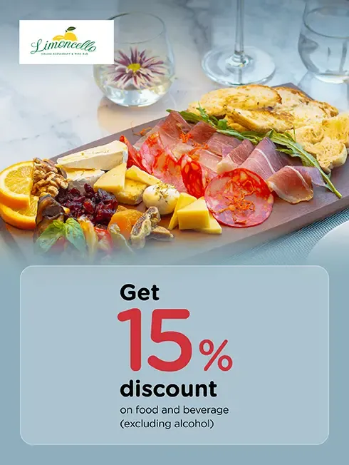 Get 15% discount on food and beverage (excluding alcohol) Cannot be used in conjunction with other promotions.