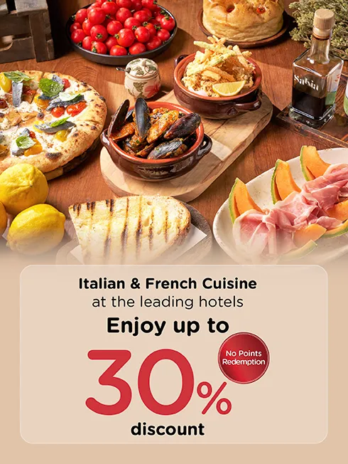 Enjoy up to 30% discount on food and non-alcoholic beverages (Lunch & Dinner)