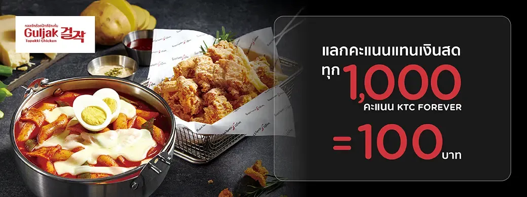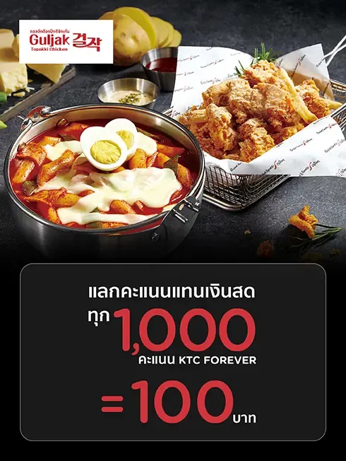 - This promotional campaign (“Promotion”) is provided by Krungthai Card Public Company Limited or KTC to offer the exclusive privileges to members of KTC credit card (“Cardmembers”) who have KTC FOREVER points (“KTC Points”) and spend on card at all Guljak Topokki & Chicken branches during 1 January 2026 - 31 December 2026 (“Promotion Period”) according to the specified terms and conditions only.