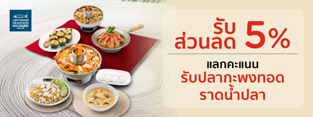 - Cardmembers who spend on card at participating stores at the minimum of 1,000 Baht per sales slip, will get 5% instant discount on the original price of goods/services purchased not including special food of goods/services purchased, dessert and alcohol beverages (Not including service charge of 10%)