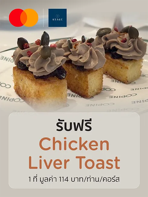 Get free 1 Chicken Liver Toast, valued at 114 baht / person / course.
