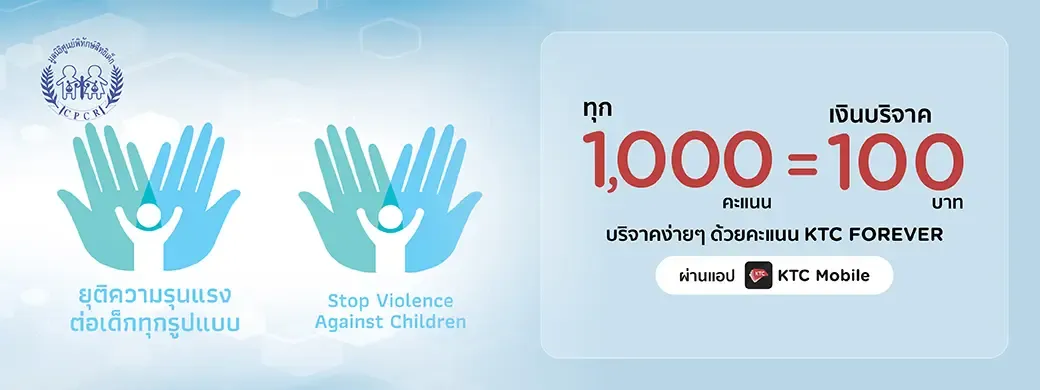 - Cardmembers can redeem 1,000 KTC points for donation 100 Baht via KTC Mobile App according to the specified terms and conditions.