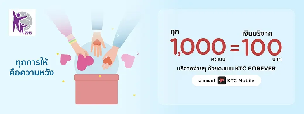- Cardmembers can redeem 1,000 KTC points for donation 100 Baht via KTC Mobile App according to the specified terms and conditions.