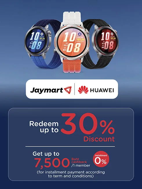 3. To be eligible to participate in this Promotion, Cardmembers who make a purchase at JAYMART (Offline store) must register successfully on the day of Card transaction has been made by sending a SMS, text JAY, <space> followed by 16-digit credit card number and send to 0613845000 SMS fee as specified by network service provide or by registering at ktc.promo/huaweiwatch, before or within the day that card transaction has been made, and receive the confirmation message from KTC.