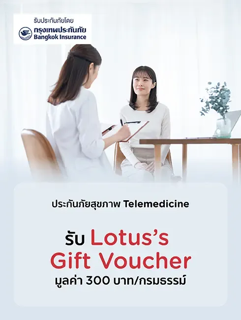 when purchasing Telemedicine Health Insurance with Bangkok Insurance through the specified online channels and pay insurance premiums with KTC credit cards will get Lotus's Gift Voucher value of 300THB/policy