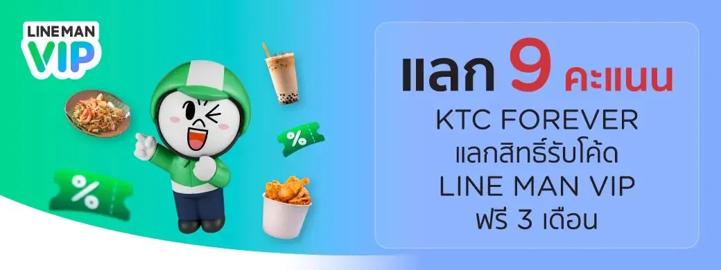 - The cardmembers can redeem 9 KTC FOREVER points for LINE MAN VIP package for 3 Months (value 57 Baht)