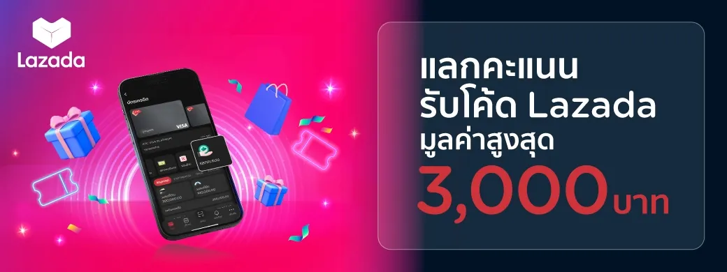 - Redeem 22,000 KTC FOREVER points to receive a 3,000 THB Lazada discount code for a minimum purchase of 5,000 THB per order.