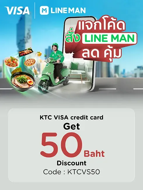 - The cardmembers who shop with the card according to specified conditions via LINE MAN Mobile Application, cardmembers will get a discount of 50 Baht on FOOD orders at a minimum spending of 300 Baht/ transaction (exclude delivery fee) Apply code >> “KTCVS50”