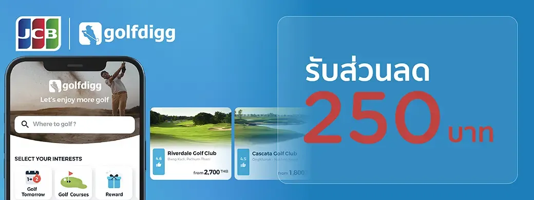 when make a booking with a minimum purchase amount of 3,000 THB / sales slip, enter JCBXGD25 into the voucher code field and pay with all types of KTC JCB credit card via Golfdigg application or www.golfdigg.com