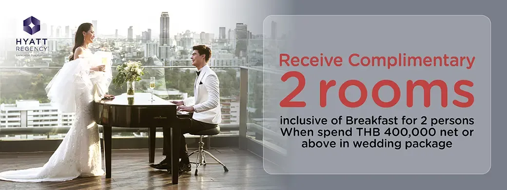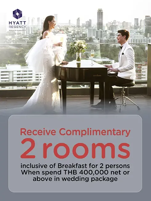 - Receive 2 complimentary Standard Room inclusive of breakfast for 2 persons on the wedding day when spend THB 400,000 net or above in wedding package. (Maximum 3 sales slip)