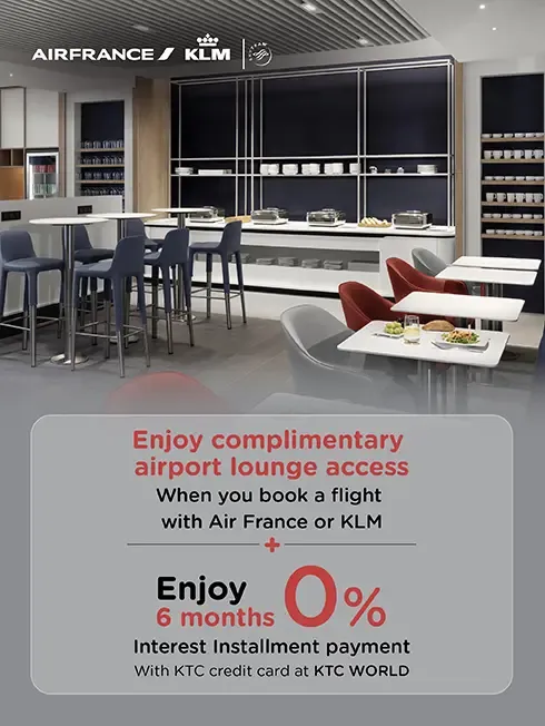 Enjoy exclusive airfare promotions with direct flights from Bangkok to Paris with Air France, and from Bangkok to Amsterdam with KLM Royal Dutch Airlines. Redeem every 1,000 KTC FOREVER points for a THB 130 discount, and enjoy 0% interest installment plan for up to 6 months when spending THB 3,000 or more per sales slip. These special privileges are reserved for KTC credit cardmembers booking through KTC World Travel Service.